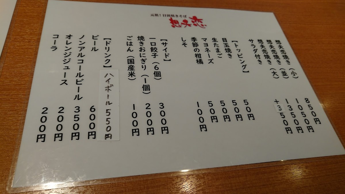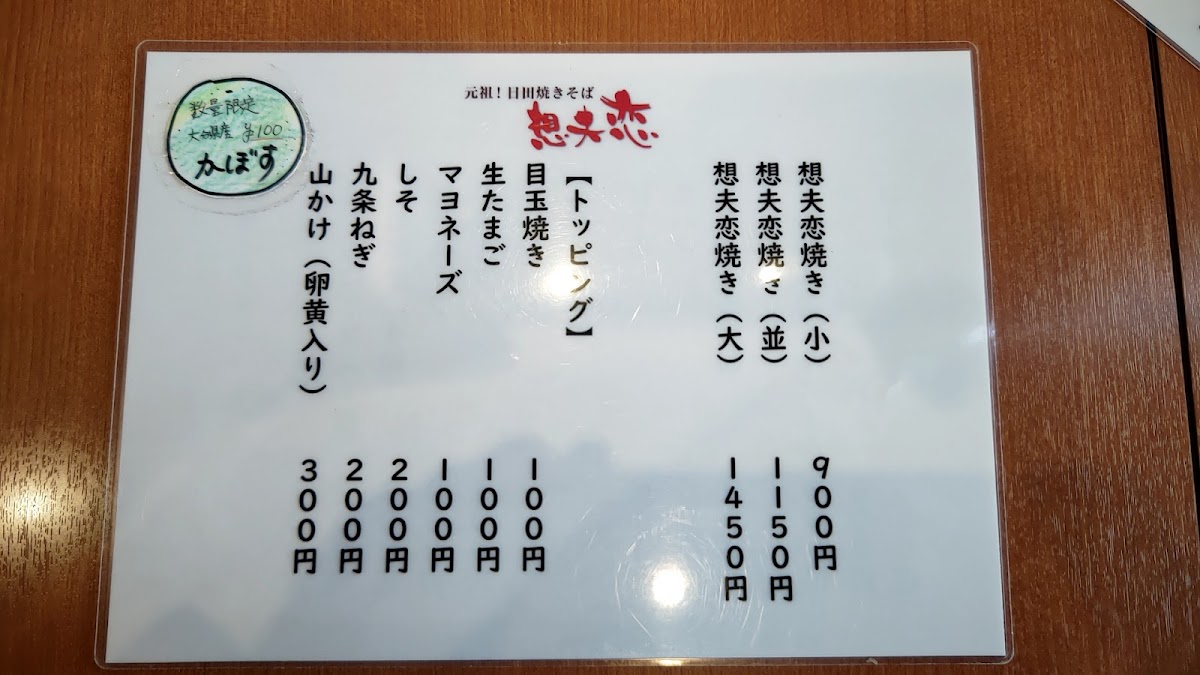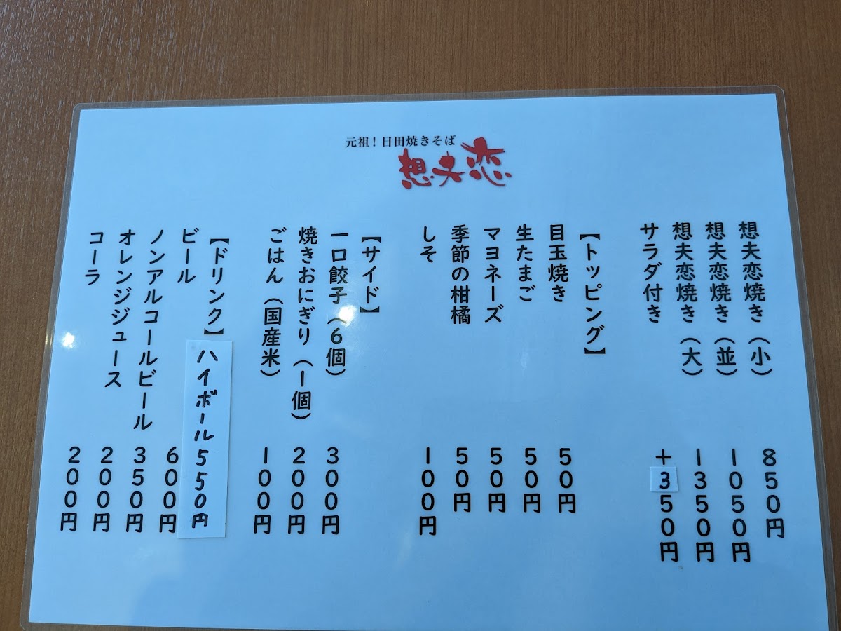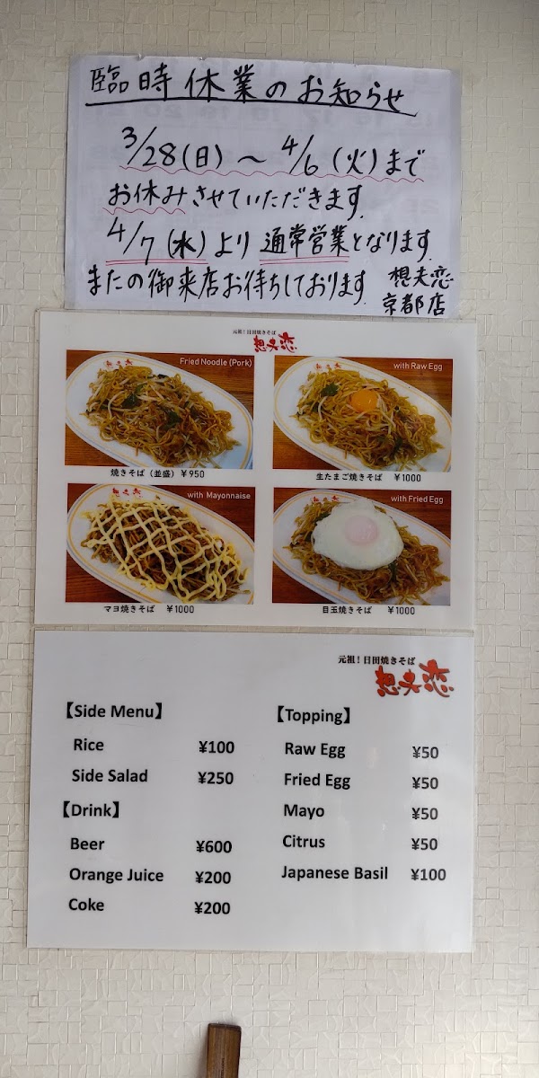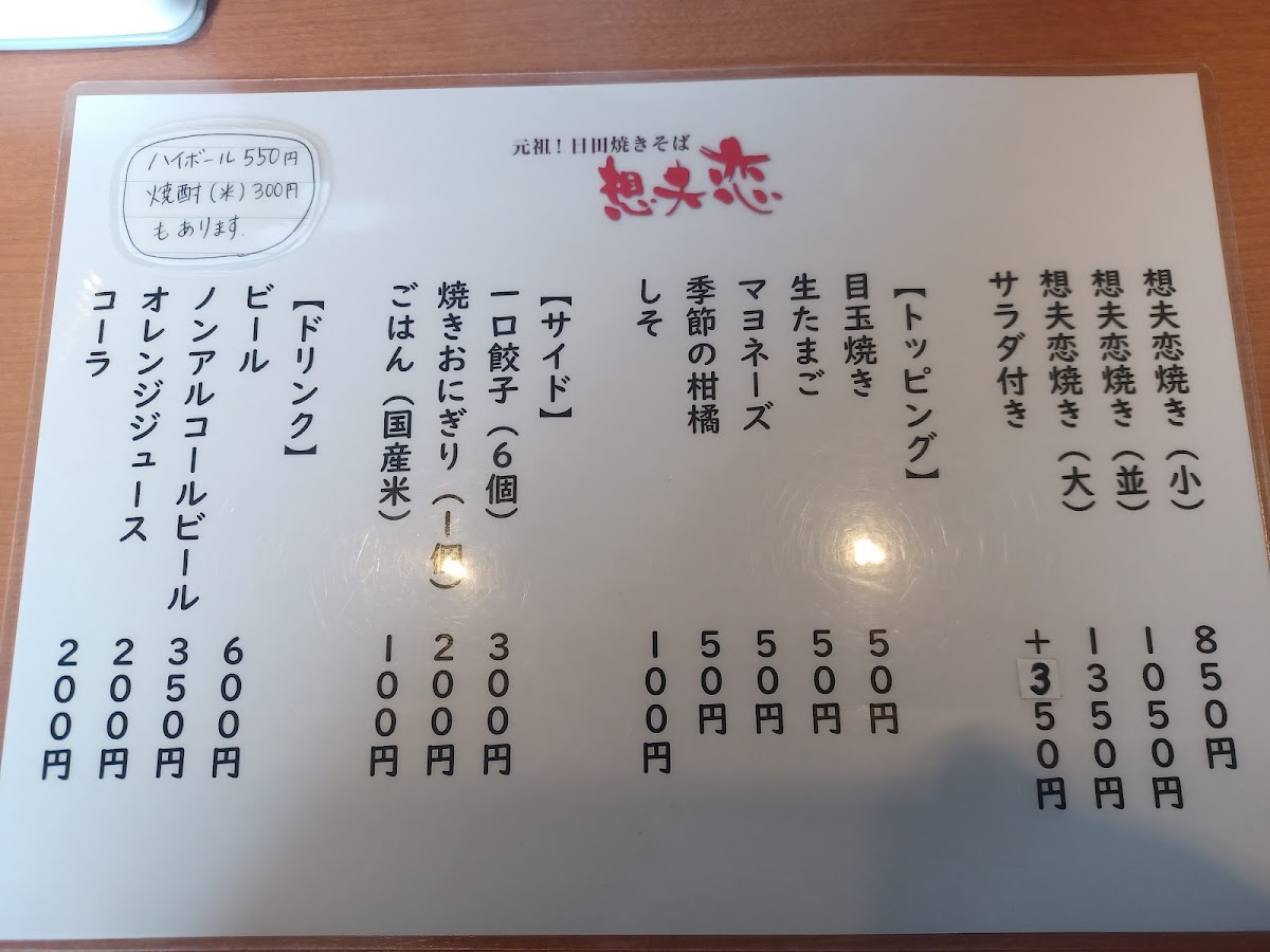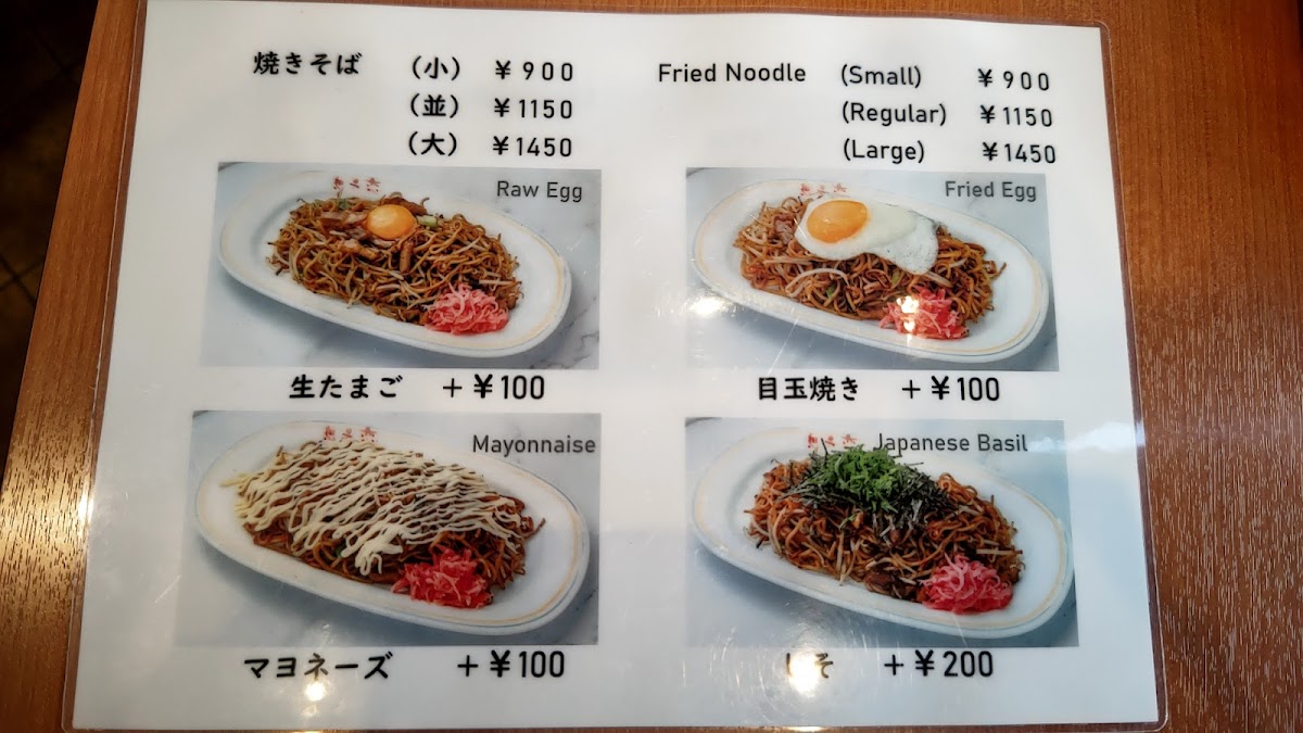 The menu at Sofuren Kyoto leaves a clear and satisfying impression by focusing on a small but well-executed selection that highlights its signature yakisoba. The standout dish, 想夫恋の焼きそば マヨネーズ, delivers a rich balance of savory noodles and toppings, elevated by the creamy touch of mayonnaise that enhances both aroma and texture. For those with a bigger appetite, 想夫恋焼き 大 offers a more generous portion, reinforcing the restaurant’s strength in hearty, comforting flavors without sacrificing consistency. To complement the food, 瓶ビール pairs naturally with the savory profile of the dishes, adding a refreshing contrast. On the side, ギョーザ brings a familiar crispness and juiciness, while 紅生姜 provides a sharp, palate-cleansing accent that cuts through the richness of the noodles. Lighter options like 特製 サラダ help balance the meal, offering freshness and variety within an otherwise robust menu. The inclusion of テイクアウト焼きそば also shows thoughtful consideration for diners who want to enjoy the restaurant’s core flavors beyond the dining space. Overall, the menu feels focused and intentional, emphasizing quality, consistency, and the restaurant’s identity through each highlighted item.